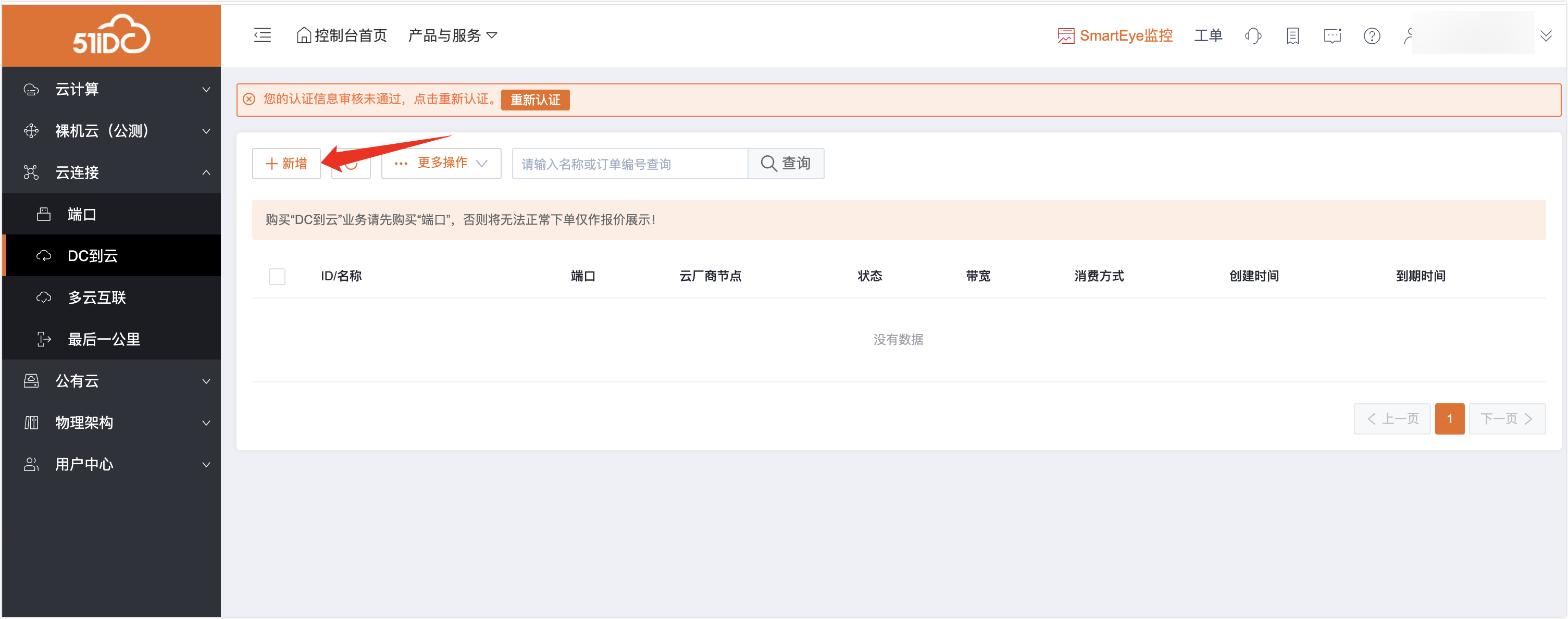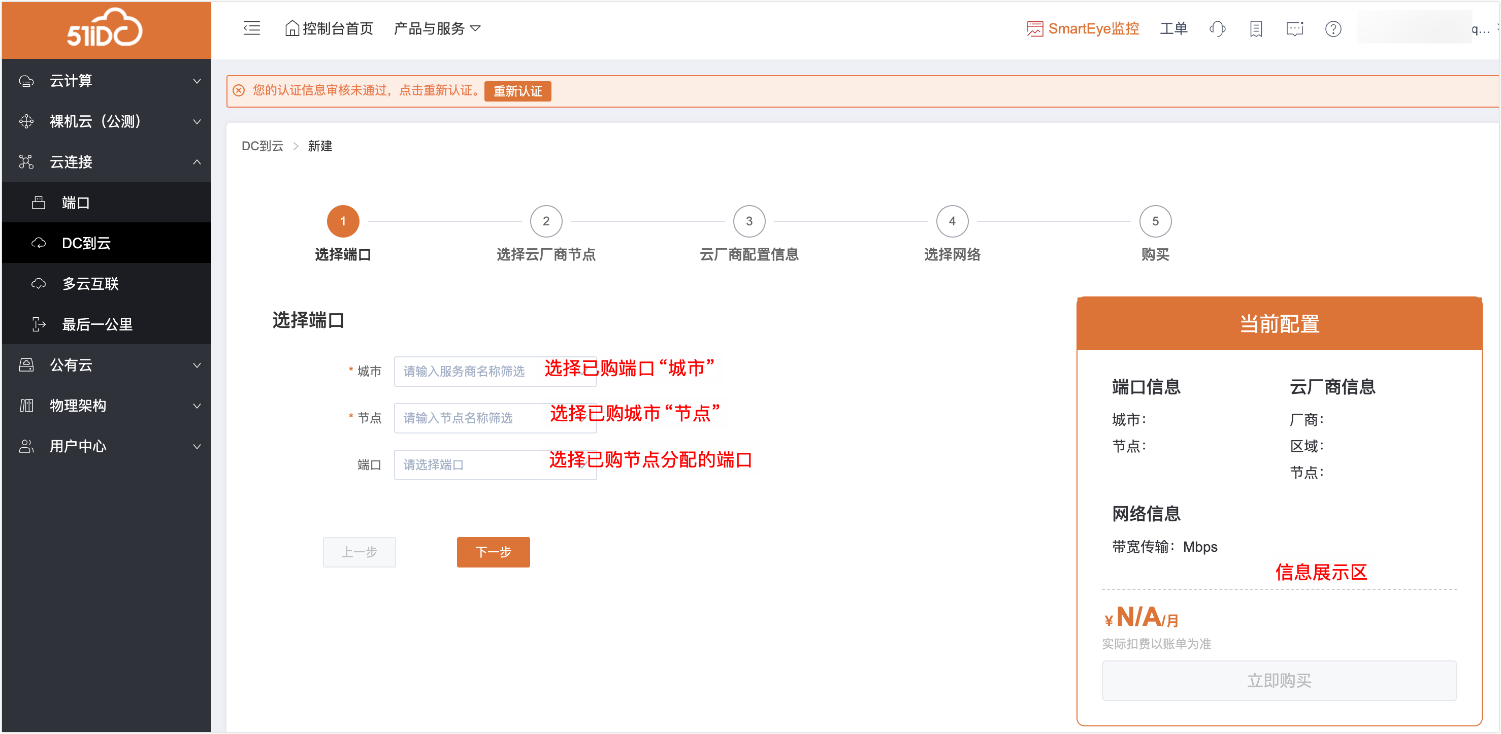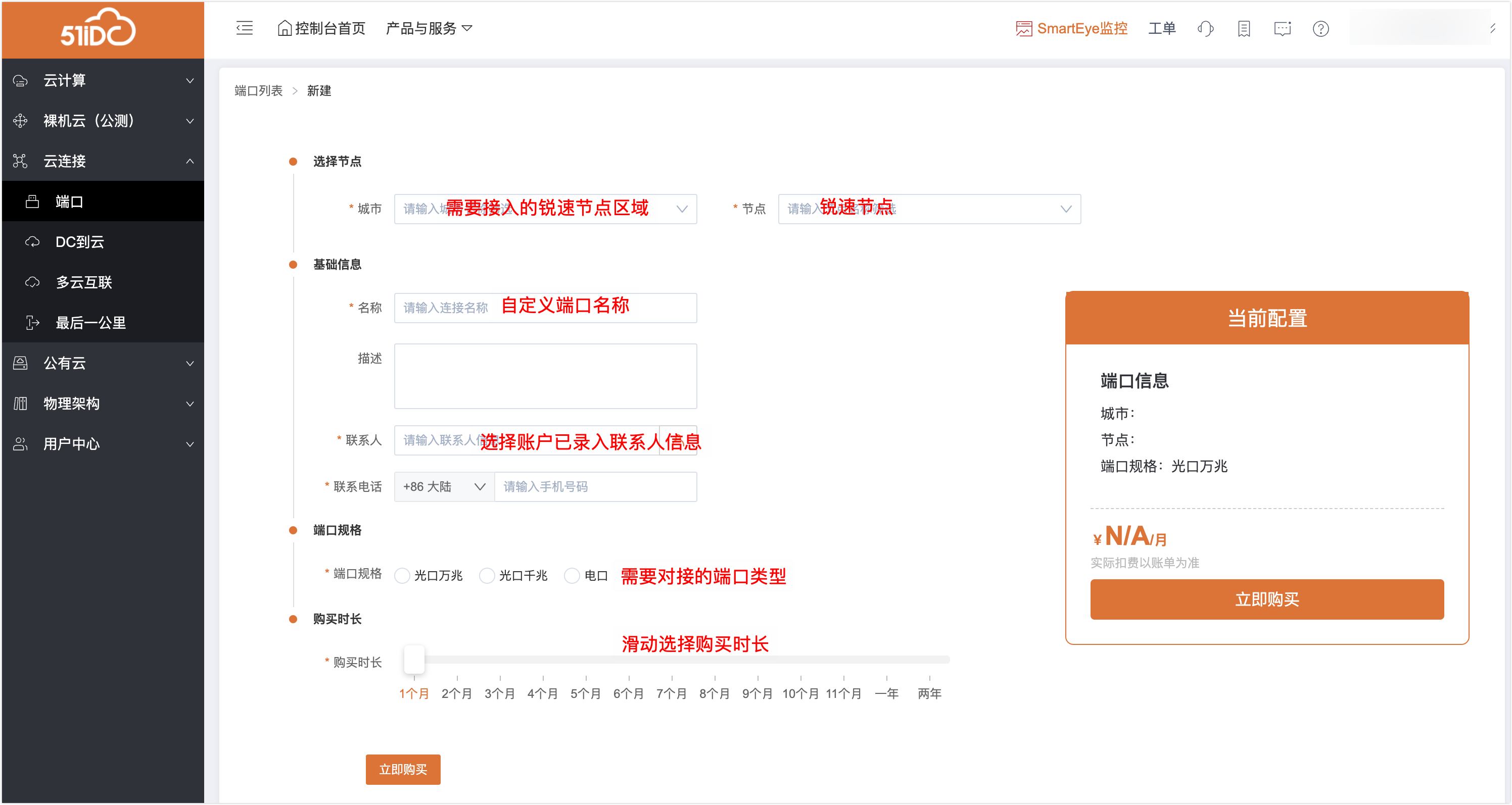 端口:为用户接入至我司网内使用的端口,配合DC到云的业务环境使用。——若不购买对应端口,DC到云的服务将只提供报价,无法进行购买。