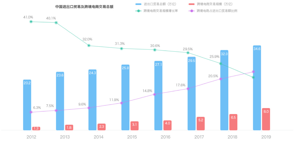 2012年起,跨境电商交易规模逐步升高,2015年随着 “互联网 +”时代的来临,其迎来高速发展期,几年间规模均在30%以上的增速,跨境电商已然占到了资本市场的风口上,或成经济增长新引擎。